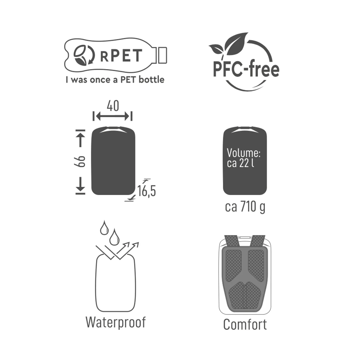 Ob auf dem Weg ins Büro, beim Städtetrip oder auf deiner nächsten Wanderung – der RANA 22 von Tambu begleitet dich überall dort, wo Funktionalität, Komfort und Nachhaltigkeit gefragt sind. Mit einem Volumen von 22 Litern, einem Gewicht von nur ca. 710 g und kompakten Maßen von 40 × 16,5 × 66 cm bietet er dir genau den Stauraum, den du unterwegs brauchst – und schützt deine Ausrüstung zuverlässig vor Regen und Feuchtigkeit.