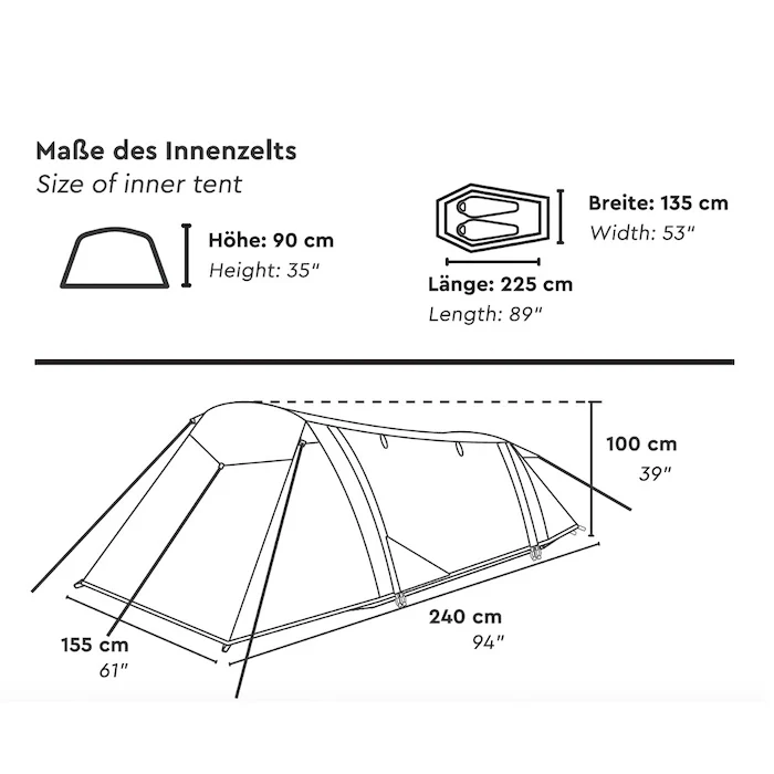 Über den seitlichen Eingang gelangst du bequem in das Zelt. Zwei integrierte Dauerventilationen mit Abstandshalter sorgen für eine kontinuierliche Belüftung des Schlafbereichs und ein angenehmes Innenklima. Im Inneren befinden sich eine praktische Innentasche für kleinere Gegenstände sowie ein Lampenhalter.